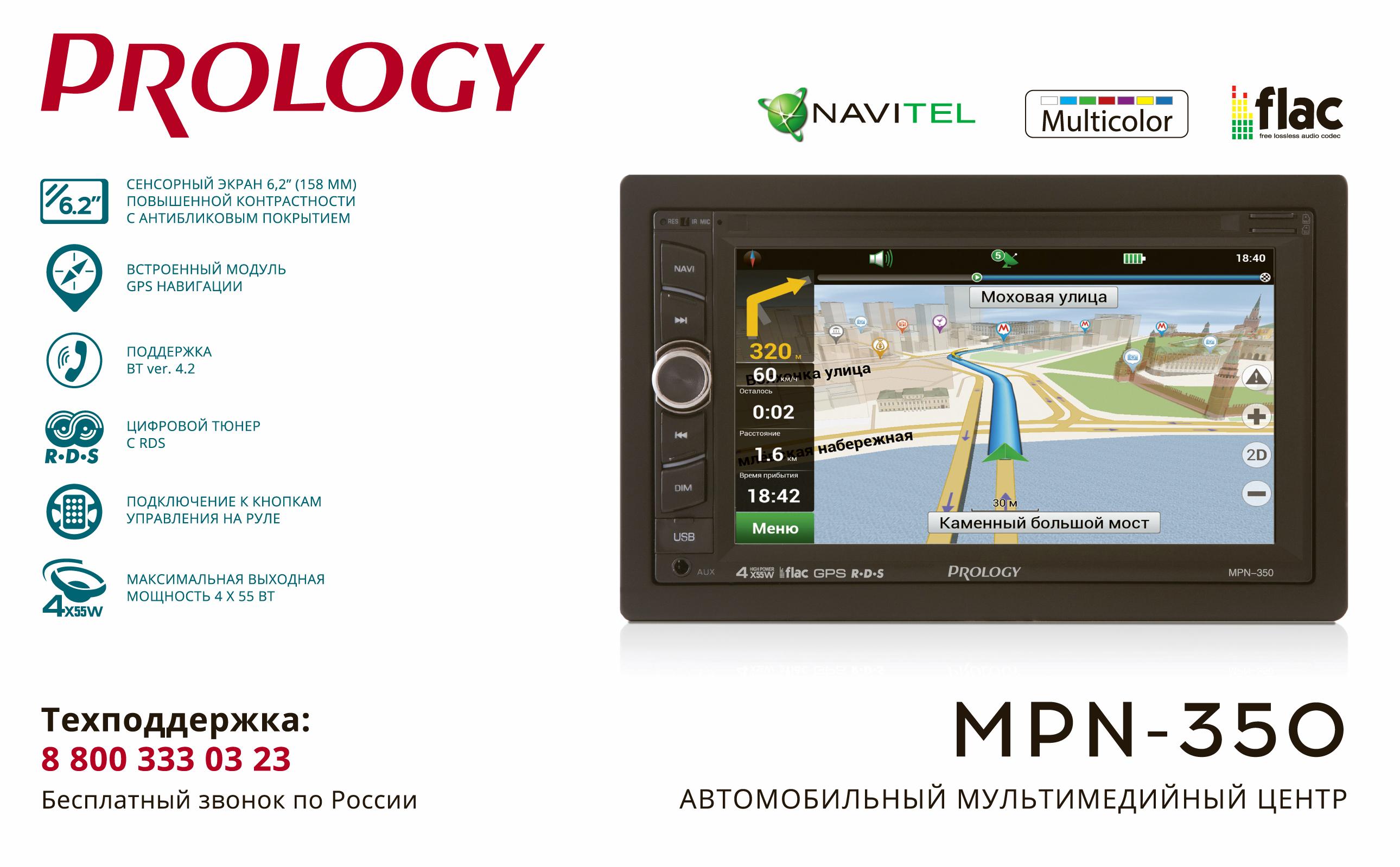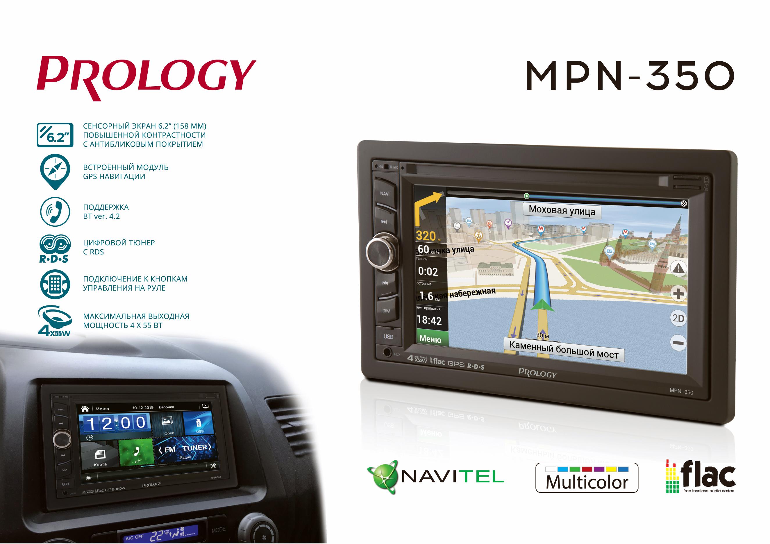 Мультимедийный навигационный центр PROLOGY MPN-350 монтажного размера 2DIN обеспечивает прием радиостанций в диапазоне FM, воспроизведение медиафайлов, записанных на карты памяти USB/microSD, работу с навигационным программным обеспечением "Навител Навигатор"®, управление мобильным телефоном и воспроизведение звука через интерфейс Bluetooth® (version 4.2)., а также передачу звука и видеоизображения с внешних источников.