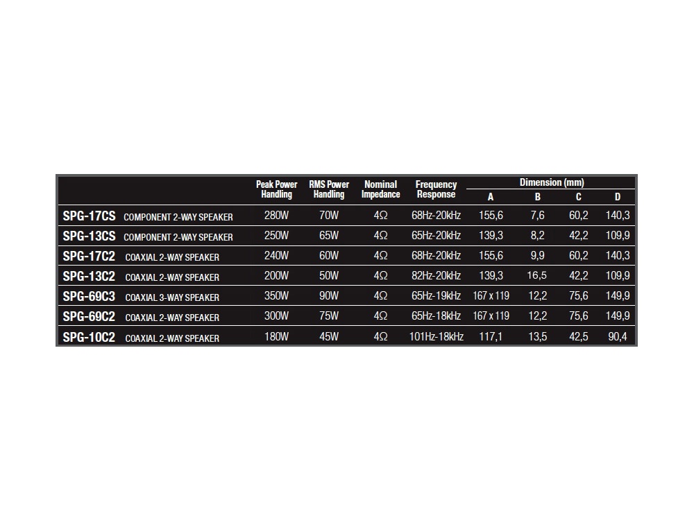 6,5" (165 мм), 2-пол. коакс, 60 Вт / 240 Вт, 68 Гц - 20 кГц, глубина 60,2 мм, чувств. 88,5 дБ Автомобильная акустика ALPINE SPG-17C2 – идеальный выбор для тех, кто ценит качественный звук в автомобиле. Эти динамики обеспечивают мощный и чистый звук благодаря высококачественным компонентам и передовым технологиям ALPINE. С мощностью 300 Вт и частотным диапазоном от 60 Гц до 20 кГц, SPG-17C2 идеально подходит для различных музыкальных стилей. Установка акустики проста и быстра, что делает её отличным вариантом для любого автомобиля. Заказывайте ALPINE SPG-17C2 в интернет-магазине Sfera.by с доставкой по всей Беларуси и наслаждайтесь качественным звуком в дороге!