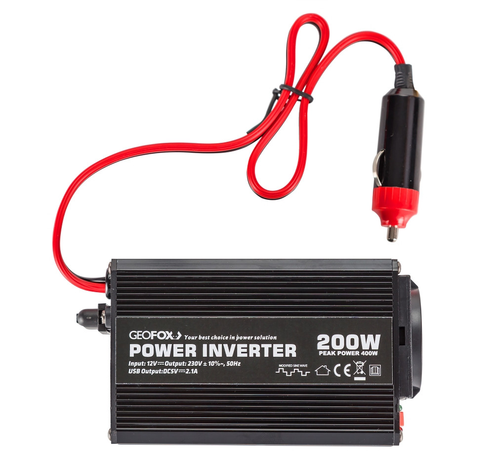 Автомобильный инвертор Geofox M 200W предназначен для питания различных устройств (мобильные устройства, КПК). Подходит для питания бытовых приборов с небольшим потреблением электроэнергии. Незаменимое устройство для длительных путешествий