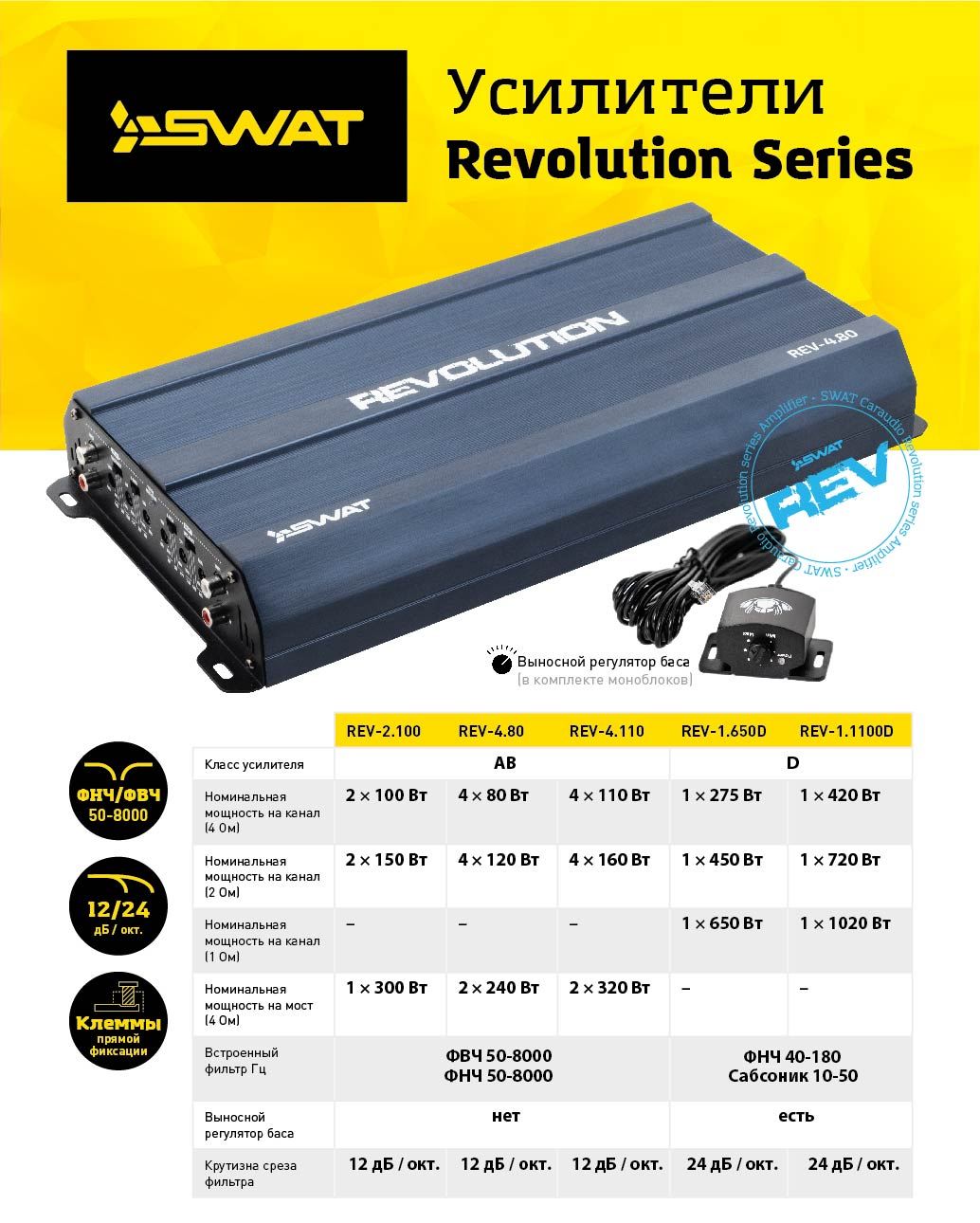 Автомобильный усилитель SWAT REV-4.110 - это высококачественное устройство, которое обеспечит мощный и чистый звук в вашем автомобиле. С этим усилителем вы сможете наслаждаться кристально чистым звучанием любимых композиций во время поездок.