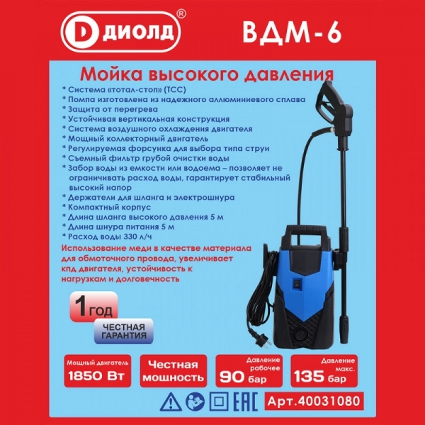 ДИОЛД ВДМ-6 Мойка высокого давления, 1850 Вт, 220В/50 Гц, 90-135 бар, 330 л/ч - Отзывы (0)