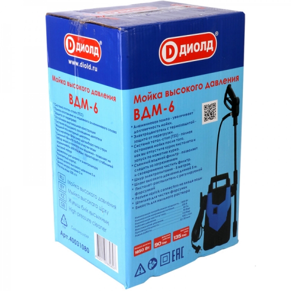 ДИОЛД ВДМ-6 Мойка высокого давления, 1850 Вт, 220В/50 Гц, 90-135 бар, 330 л/ч Мы являемся официальными диллерами компании ДИОЛД
