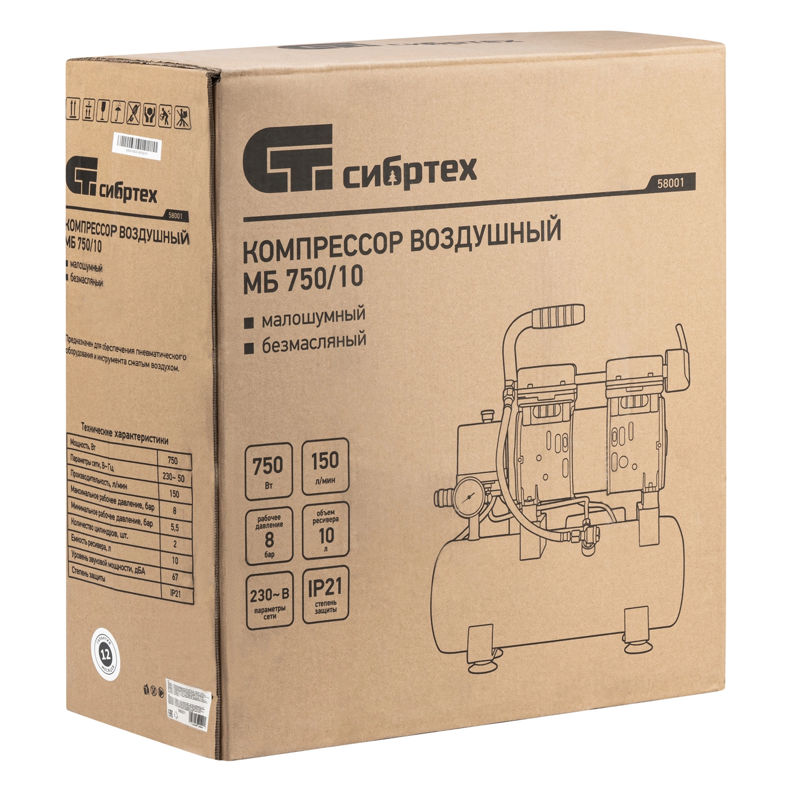 Компрессор безмаслянный малошумный Сибртех МБ 750/10,750 Вт, 10 л, 150 л/мин Мы являемся официальными диллерами компании CИБРТЕХ