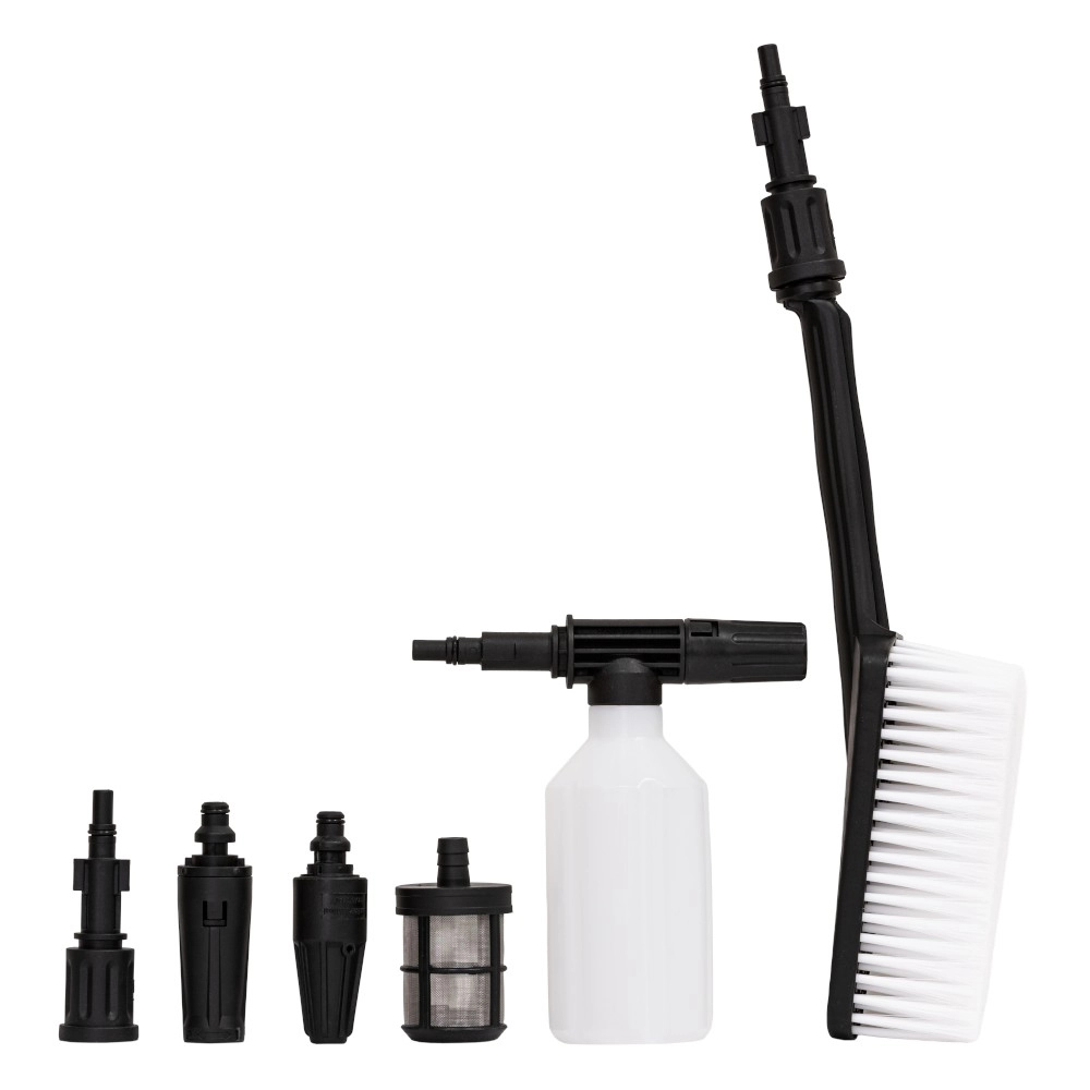 Весит мойка всего 6,5 кг — легко переносить по участку, не напрягая спину. Семиметровый шланг обеспечивает свободу движений, а комплект насадок — от веерной до грязевой фрезы — открывает простор для экспериментов с чистотой. Пенная насадка и моющая щетка помогут добиться идеального результата без лишних усилий.