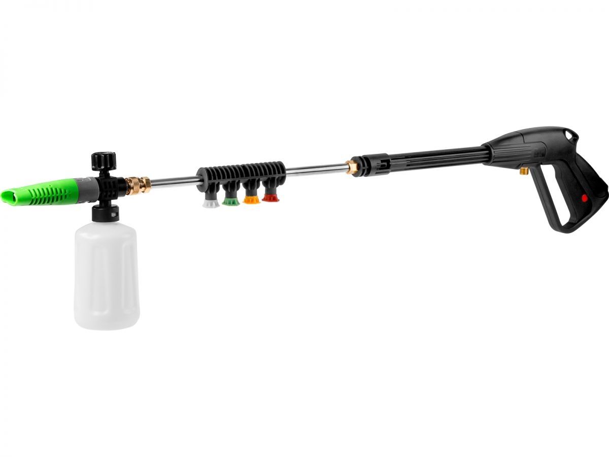 Очиститель высокого давления позволяет очистить автомобиль, садовый инструмент, а также будет незаменимым помощником при уборке помещения или фасада здания. Данная модель достаточно компактна и удобна в использовании. Оснащена асинхронным бесщёточным двигателем, за счет чего служебный ресурс очистителя значительно выше щёточных моделей, двигатель меньше нагревается и подходит для длительного использования. Алюминиевый корпус насоса обеспечивает долгий срок службы. Функция самовсасывания позволяет использовать очиститель без подключения к водопроводу. Материал корпуса - ударопрочный армированный пластик. Благодаря этому модель устойчива к механическим повреждениям и преждевременному износу. Устройство характеризуется высокой производительностью, что позволяет эффективно удалять загрязнения. В комплект поставки входит пеногенератор, грязевая фреза для удаления стойких загрязнений, 4 веерных сопла под различные нужды, фильтр тонкой очистки. Комплект поставки: