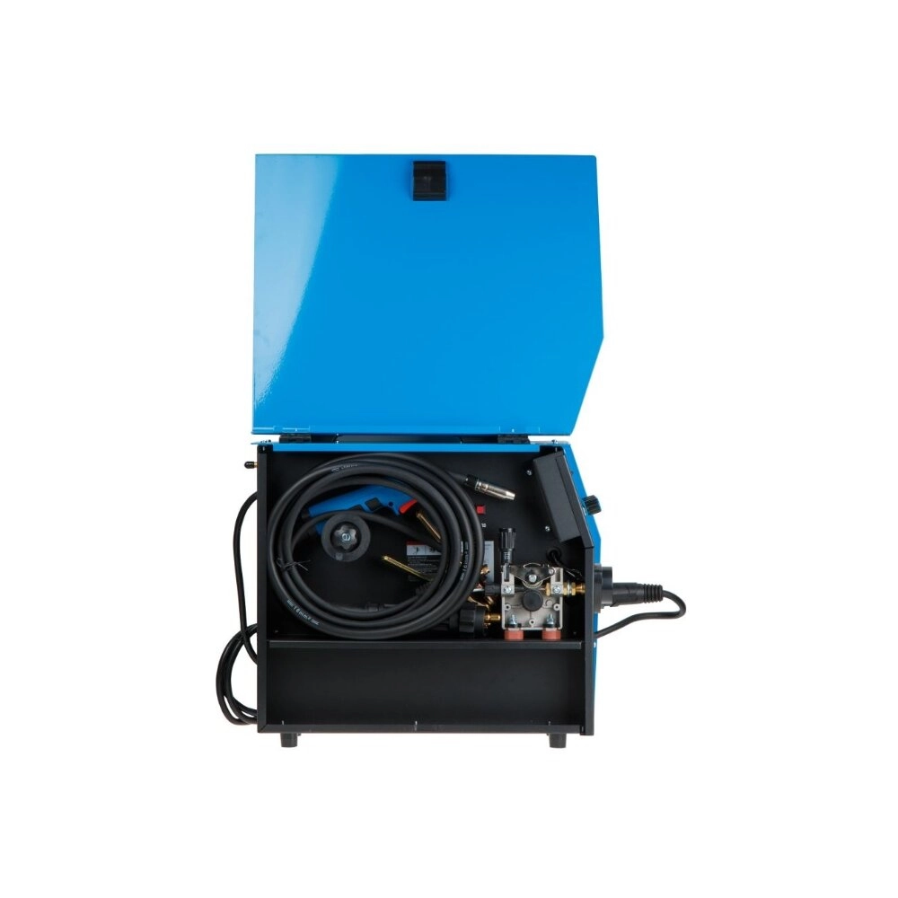 Аппарат оснащен ЕВРО-разъемом, горелкой MIG 3 метра и возможностью смены полярности для сварки проволокой без газа (FLUX).