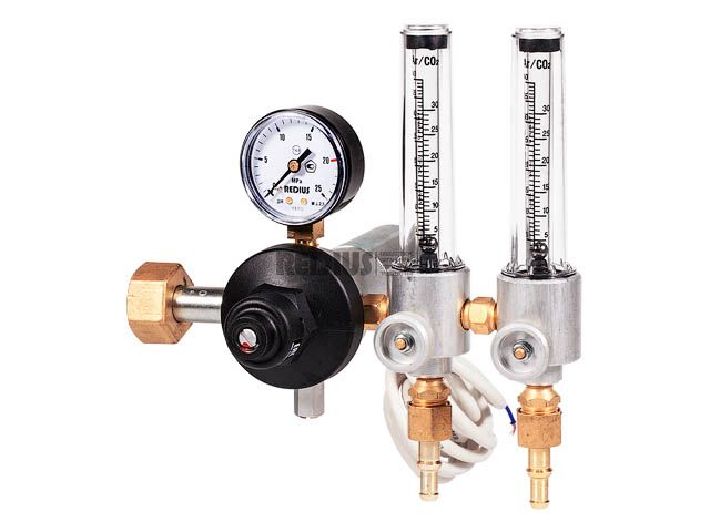Регулятор расхода баллонный одноступенчатый предназначен для понижения и регулирования давления углекислого газа или аргона, поступающего из баллона, и автоматического поддержания постоянного рабочего расхода газа на выходе регулятора в ходе проведения работ. Подогреватель используется для предотвращения замерзания механизмов редуктора при больших расходах газа или при низких температурах окружающей среды. Подогрев осуществляется за счет теплообмена между газом и горячими стенками корпуса подогревателя.
