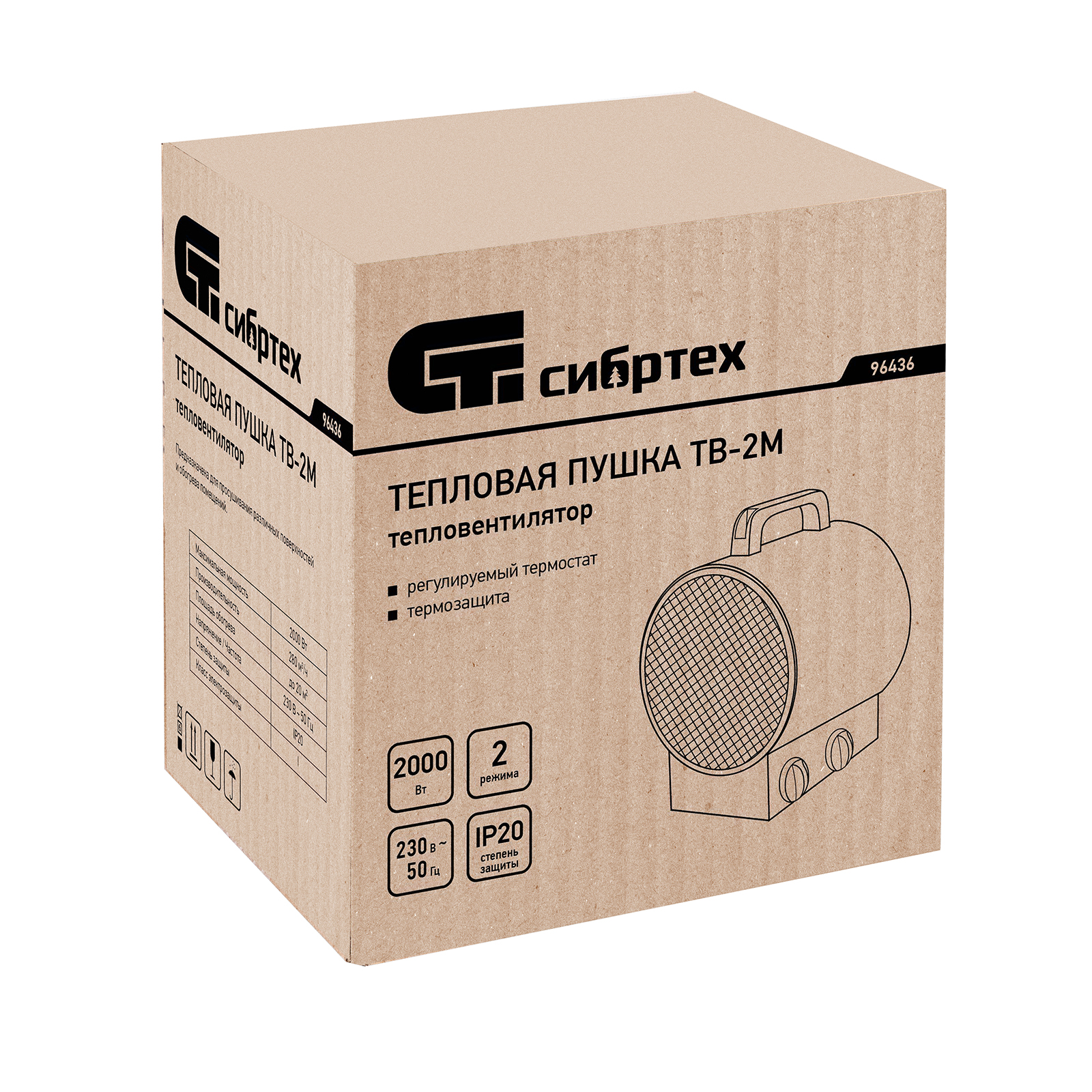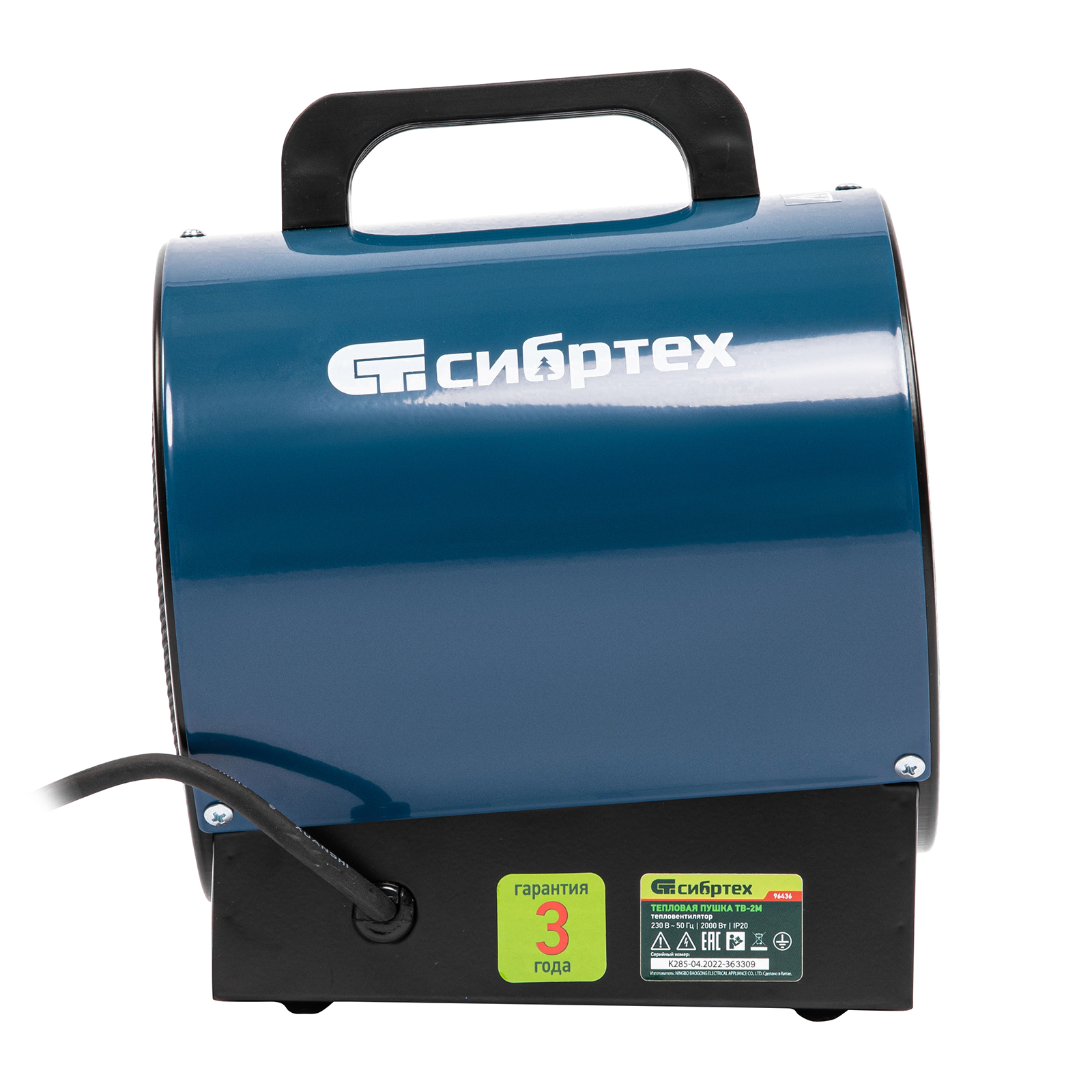 С двумя режимами работы вы сможете выбрать оптимальный уровень обогрева в зависимости от ваших нужд. Пушка CИБРТЕХ ТВ-2М — это не просто техника, это ваш комфорт в холодное время года. Гарантия 3 года подтверждает надежность и качество, а стильный дизайн впишется в любой интерьер.