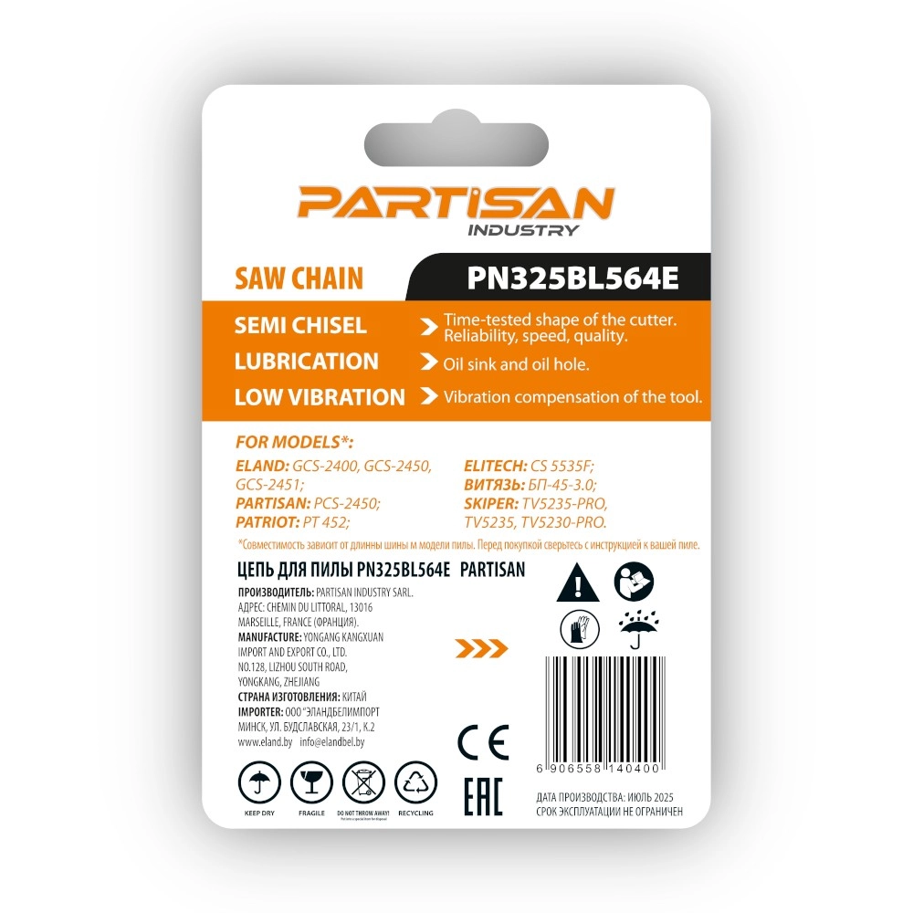 Совместимость с популярными моделями бензопил — ELAND GCS−2400, GCS−2450, GCS−2451, PARTISAN PCS−2450, PATRIOT PT 452, ELITECH CS 5535F, ВИТЯЗЬ БП−45−3.0, SKIPER TV5235−PRO, TV5235, TV5230−PRO — делает PARTISAN PN325BL564E универсальным решением для профессионалов и домашних мастеров.