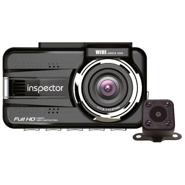 INSPECTOR Octopus - это двухканальный видеорегистратор, оснащенный GPS-модулем и базой данных стационарных радаров и камер. За качество фронтальной съемки Full HD (1080p) и задней HD (720p) отвечают: двухядерный процессор AIT и cветочувствительная матрица SONY. Шестислойный стеклянный объектив с широкоугольным обзором в 155° обеспечивает достойный обзор. А ЖК-экран с диагональю 3"
