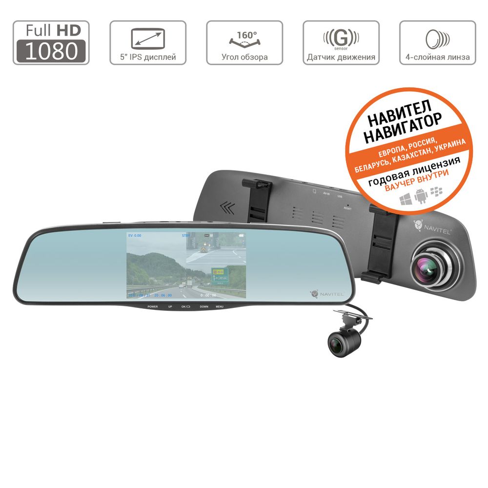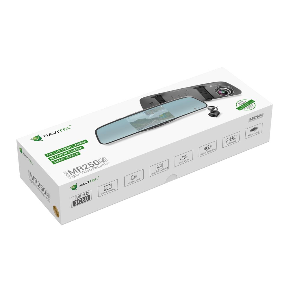 NAVITEL MR250 – 5-дюймовое smart-зеркало заднего вида, которое сочетает в себе функции, необходимые для безопасного вождения. Устройство оснащено видеорегистратором, который записывает все, что происходит на дороге перед вашим автомобилем, и дополнительной камерой заднего вида. Зеркало встроено в прочный металлический корпус. Камера заднего вида устойчива к воздействию влаги и может крепиться снаружи автомобиля на рамку номерного знака.