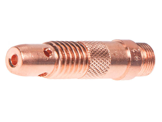 Зажим цанги является расходным элементом TIG горелки. Предназначен для фиксации электрода с цангой в TIG горелке. Отверстия на зажиме служат для распределения потока защитного газа.